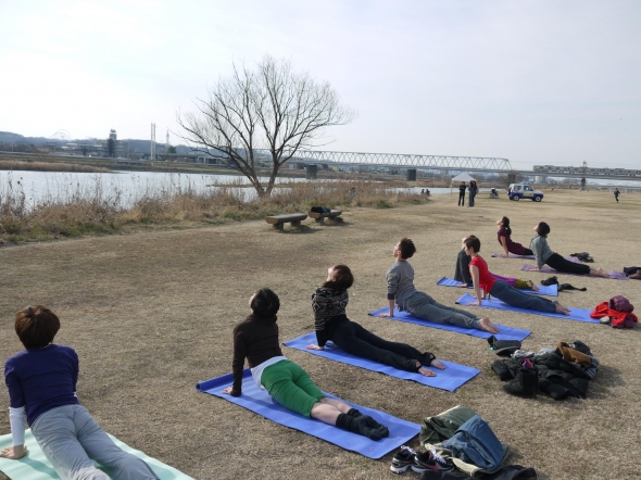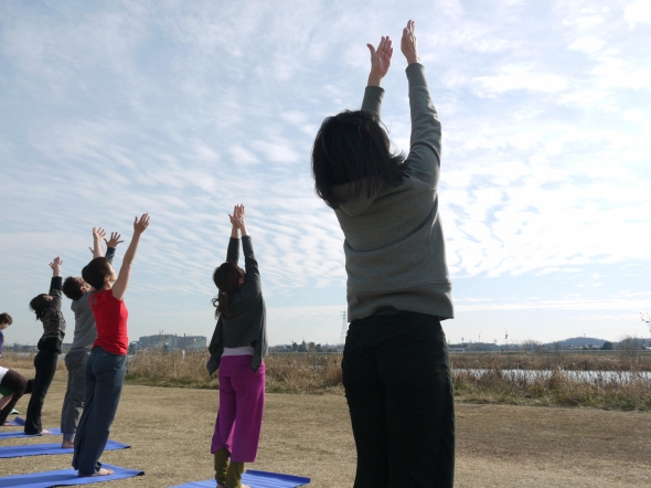 晴れ渡る空の下、多摩川の河川敷で呼吸を合わせた太陽礼拝も行いました。